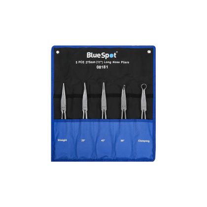 The Blue Spot Tools 5 PCE 275mm (11") Long Nose Pliers are manufactured from chrome vanadium steel for increased durability. Soft-grip handles for increased comfort. Set includes straight, 20°, 45°, 90°, clamping plier. 13mm hole diameter. Supplied in wallet.
