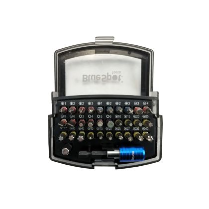 The Blue Spot Tools 32 PCE Mixed Coloured Bit Set is ideal for many standard screw types and sizes. The bits are manufactured from S2 steel for increased durability. Bit holder manufactured from chrome vanadium steel. Contains Pozi, Phillps, Slotted, Hex, Torx and Tamper proof Torx bits. The case includes a useful belt clip to help you transport the bits.