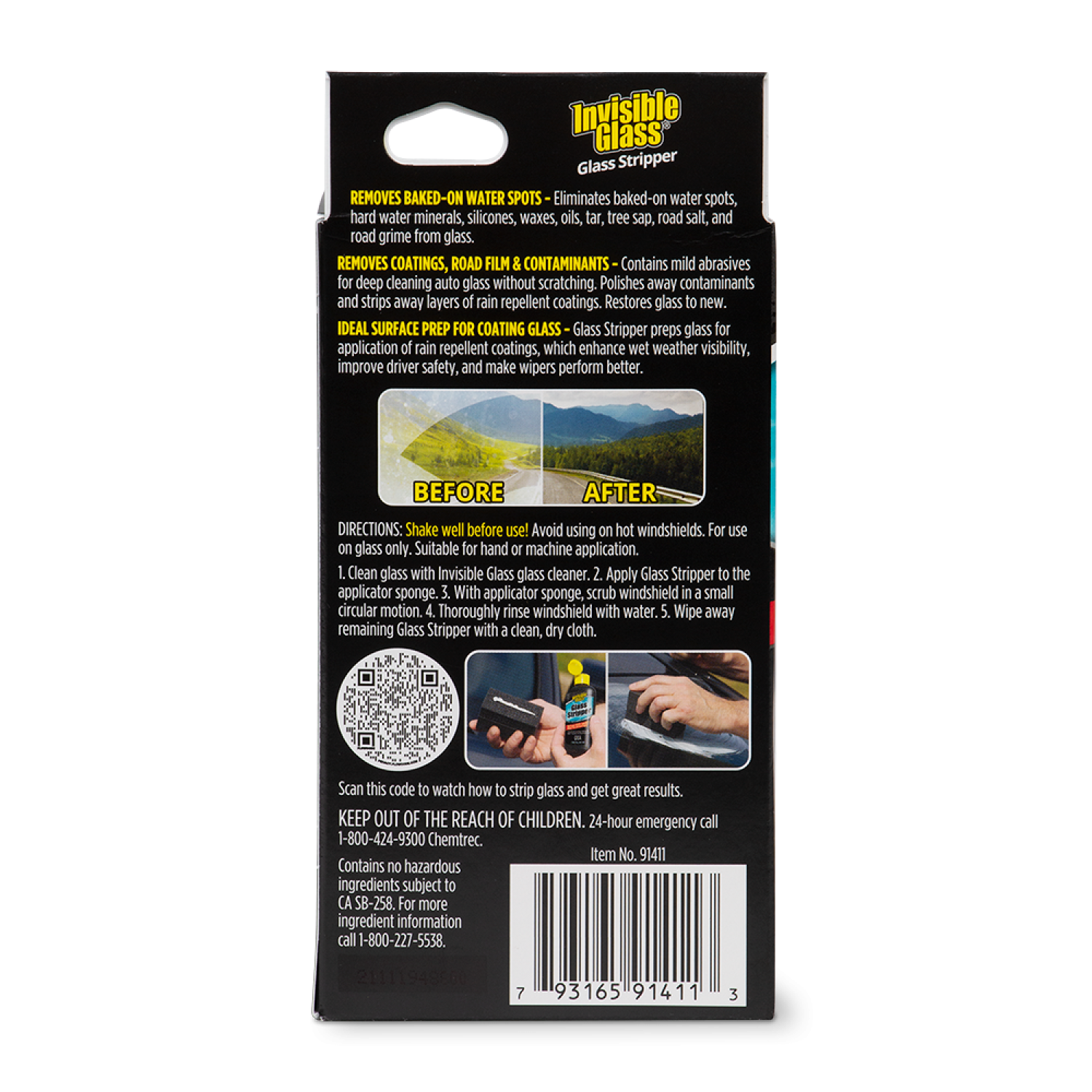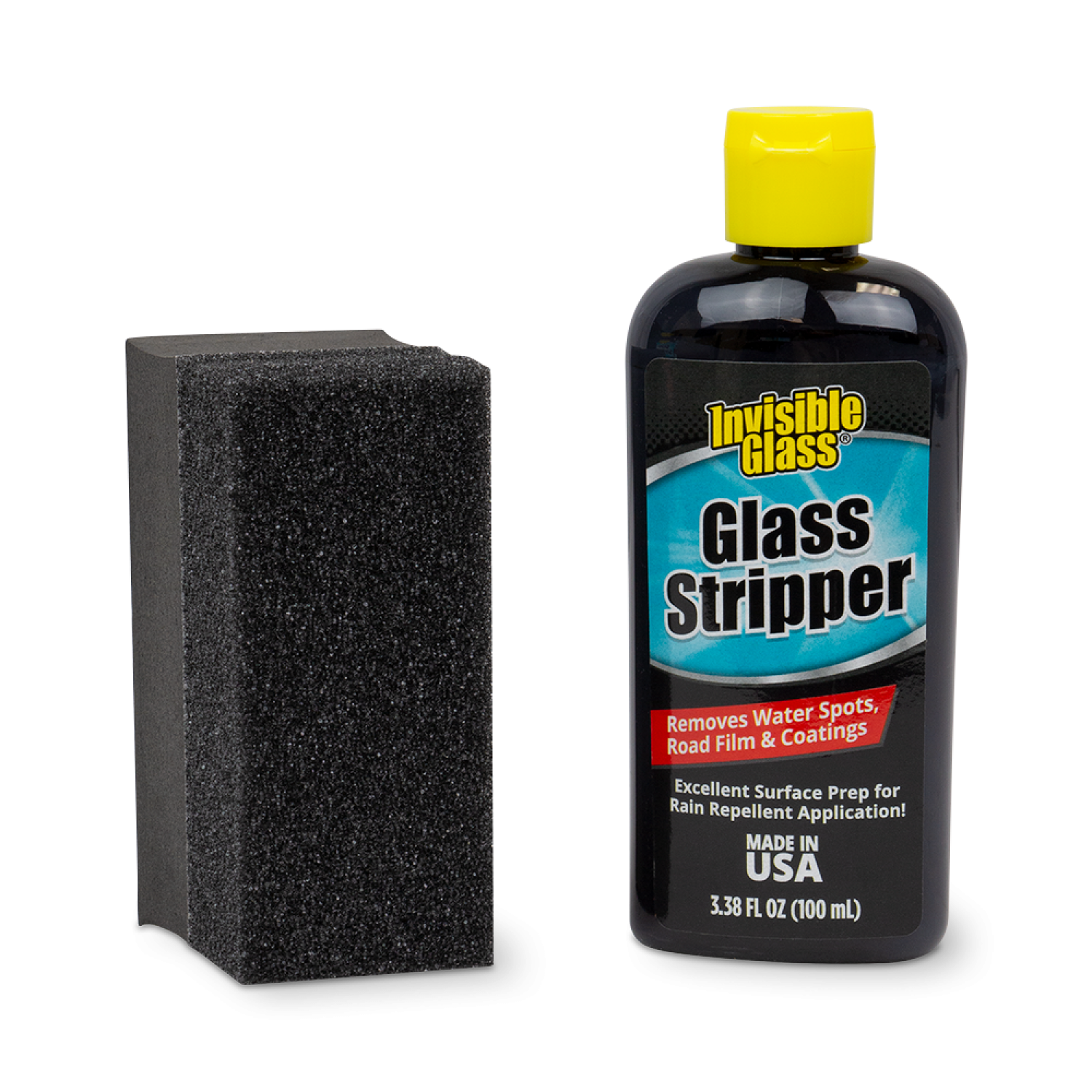Glass Stripper prepares your glass for rain-repellent or semi-permanent coatings. Effectively strip your windshield of silicone, waxes, oils, tar, tree sap, road salt, and road grime to prepare glass for productive produce application. APPLY RAIN REPELLENT AFTER USE.