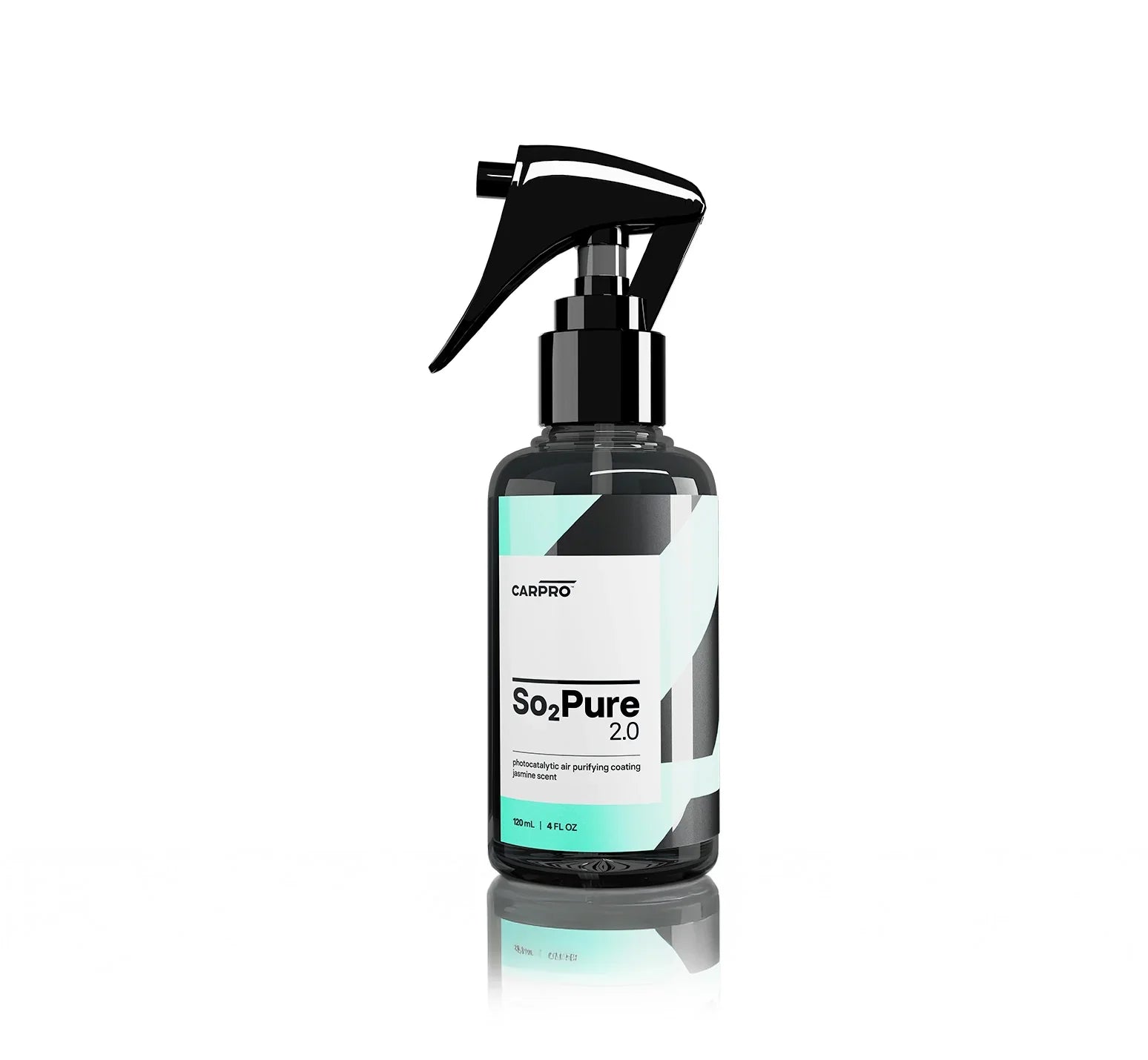 CARPRO SO2Pure is a nano-scale TiO2 based photocatalytic automotive interior coating, which represents a huge leap forward in air purification technology. Designed for people sensitive to allergens, traffic fumes, and other harsh odors. When exposed to light, So2Pure treated surfaces actively destroy even the toughest of odors and pollutants, leaving behind nothing but clean, fresh air.